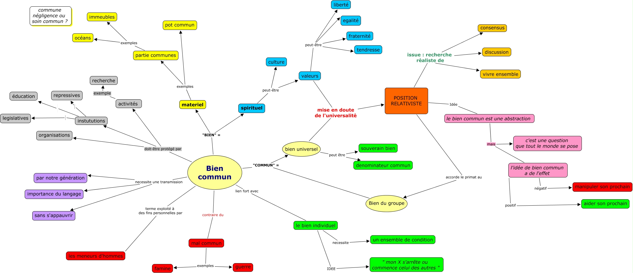 La lisibilité de la carte est parfaite sur ce lien: je l’ai en totalité sur mon écran. L’arborescence qui me plairait d’approfondir concerne les énoncés rouge et leur lien avec le bien commun. Le « mal » commun : est-ce bien le contraire du bien commun ? Il me semble de n’avoir jamais entendu cette expression là, et cela doit avoir du sens dans la détermination du bien et du mal. J’ai entendu de parler de la banalité du mal, mais jamais du mal commun.